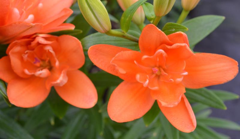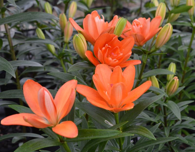 Showy flowers with intense fragrance grow from bulbs of overlapping fleshy scales. Flowers stems bear whorled narrow leaves with several flowers and buds at the top. Great cut flower.  Bright orange double flowers! Part shade or in a cool sunny spot.  Plant bulb at least 4 inches deep in moist, rich, acid, well drained soil.  Can be left undisturbed for many years and allowed to multiply naturally. Zone 3-9.