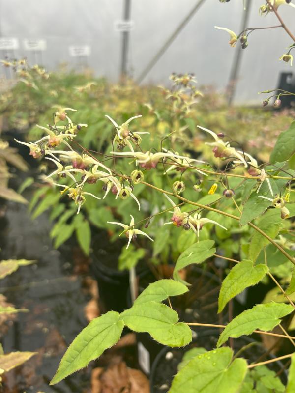 This evergreen epimedium almost appears to float over the large rough foliage that emerges in spring. The leaves are mottled with red.