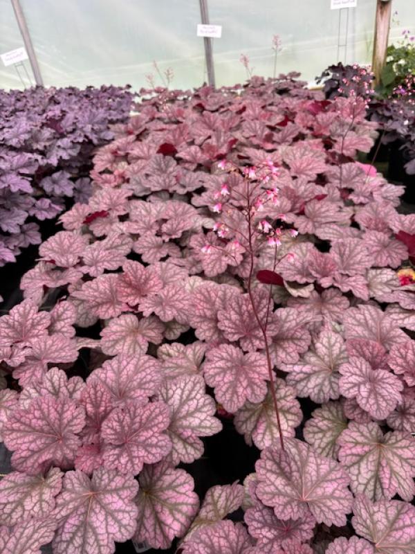 Heuchera 'Berry Smoothie' is a gorgeous rose-pink foliage plant that blooms small white blossoms. This stunner enjoys part to full Shade and moderately well-drained soil. Berry Smoothie is a true four season of foliage interest. For a fun combo, combine it with the cool-blue leaved hostas.