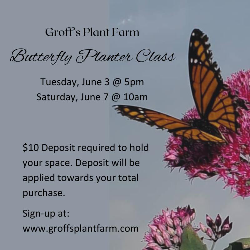Do you want to help the butterfly population? Sign up today to design your own Butterfly Planter class on June 13! Learn which plants will help host the larvae and provide nectar to the adults (and other pollinators).