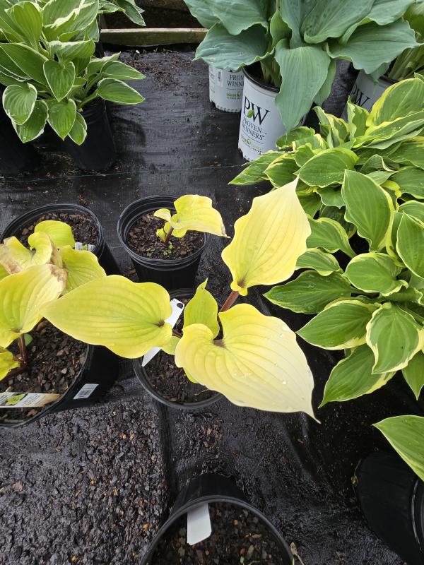 Emerges bright yellow with a little white wax frosting. Purple fills the petiole and extends up the middle of the leaf and fans out at the base of the leaf. In weeks the yellow becomes a unique blue-green emulsion, more pronounced in the shade