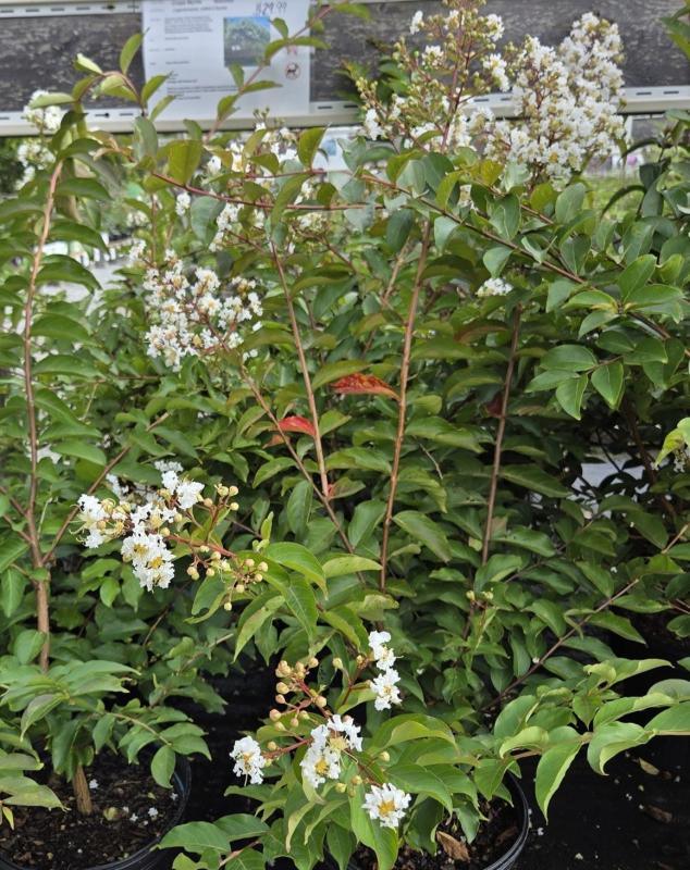Lagerstroemia Natchez is a beautiful Crepe Myrtle with large papery white flowers that show off against dark green foliage. They bloom mid to late Summer and bloom in large clusters. In Fall, the foliage turns shades of orange and red before dropping off for the winter to reveal the cinnamon brown peeling bark. They prefer full sun and average, well-drained soil.