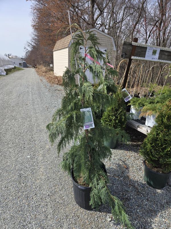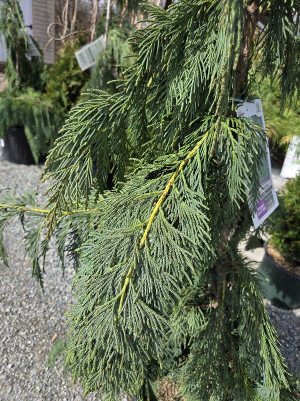 Blueish green sprays hang down from horizontal branches. Has an upright and very striking structural appeal. Evergreen tree is easy to grow and gives high visual impact. Great addition to a large mixed border, hedge, or specimen tree.