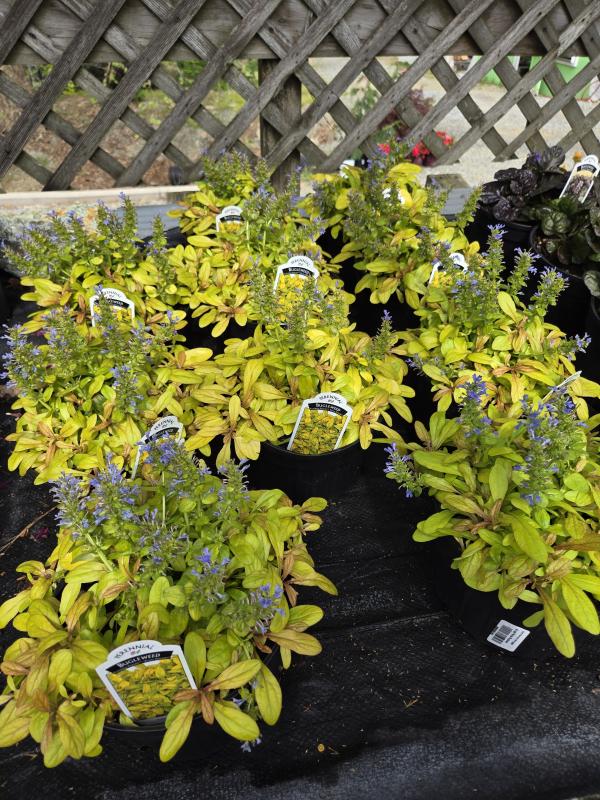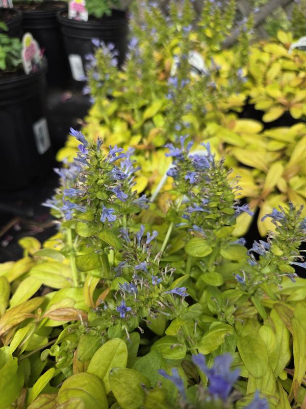 This striking variety shows off with evergreen, golden foliage featuring orange central veins. It forms an attractive, dense carpet making it an excellent ground cover. Showy, cobalt blue flower spikes sit atop the foliage. Prefers to be planted in neutral, moist yet well draining soils in part to full shade. Will tolerate more sun if kept constantly moist. Attracts pollinators, deer and rabbit resistant.
