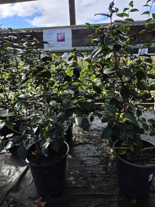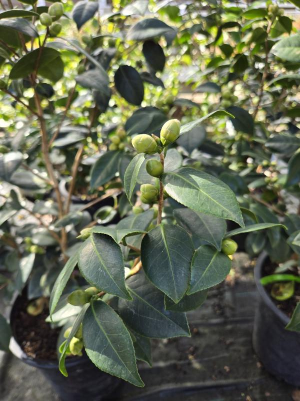 Glossy dark green evergreen leaves, upright habit. Beautiful double blooms open in late winter. Plant in a protected area on the warm side of your house or amongst other evergreens to provide a natural wind break.