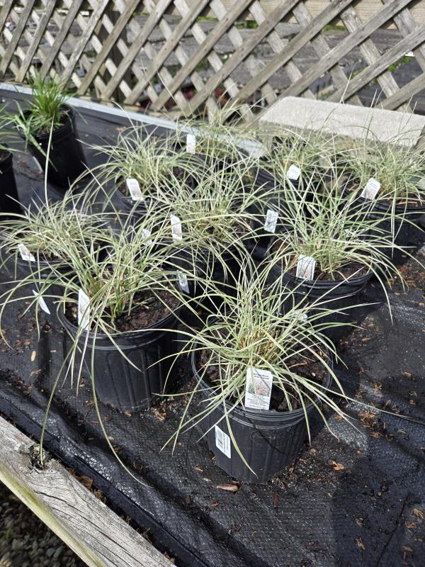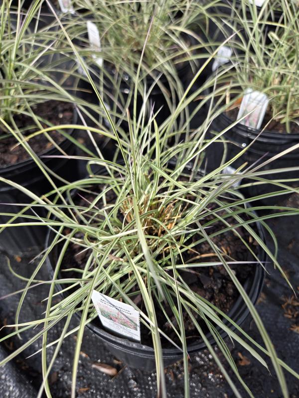 Compact narrow green foliage turns burgundy in the fall. Topped with flower seed heads that hold up well over the winter. Divide Miscanthus in the spring or early summer. Full sun in average soil. Once established, drought resistant. Cascading silvery blooms that change to burgundy