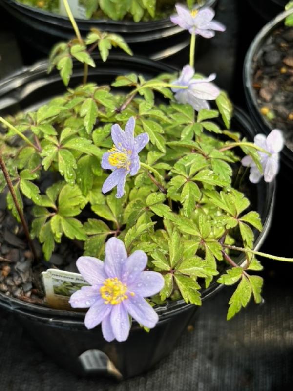 Low-growing herbaceous perennial that spreads by branched and creeping rhizomes to form an attractive ground cover in shaded woodland areas. Single lavender blue flowers with an attractive yellow center. Will perform best in humus rich, moist yet well draining soils in part shade to part sun. Once established, it is drought tolerant when dormant. Deer and rabbit resistant, attracts pollinators.