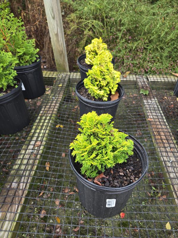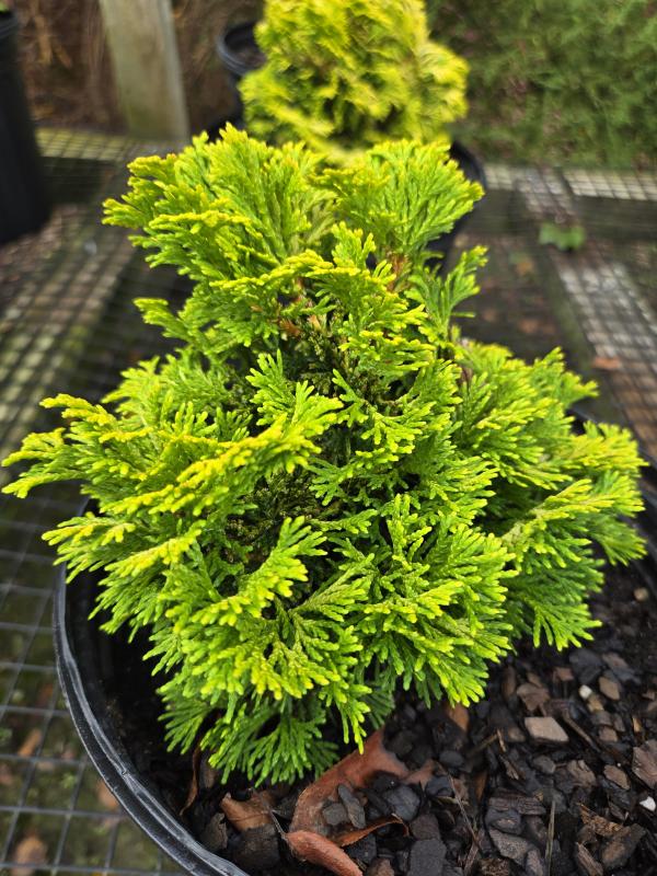 Fan shaped sprays of evergreen yellow foliage. Slow growing conical habit.