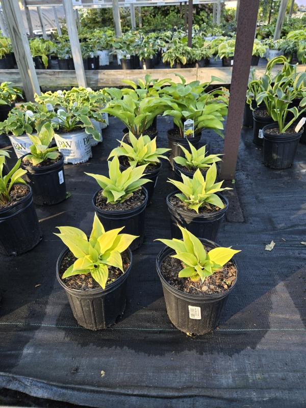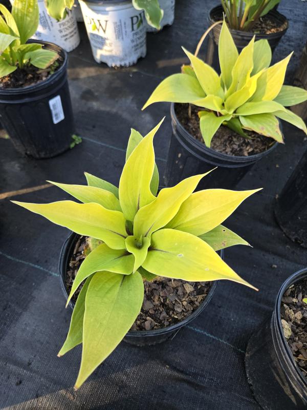 The bright yellow, cupped and slightly corrugated leaves are held by purple petioles. The purple saturates the base of the leaf and bleeds halfway up the leaves. A truly unique variety. Blooms throughout the summer. Reddish purple flowers are held above the foliage on purple scapes. Plant in average, consistently moist well draining soil in part sun to full shade. Leaves will scorch if left in full sun.
