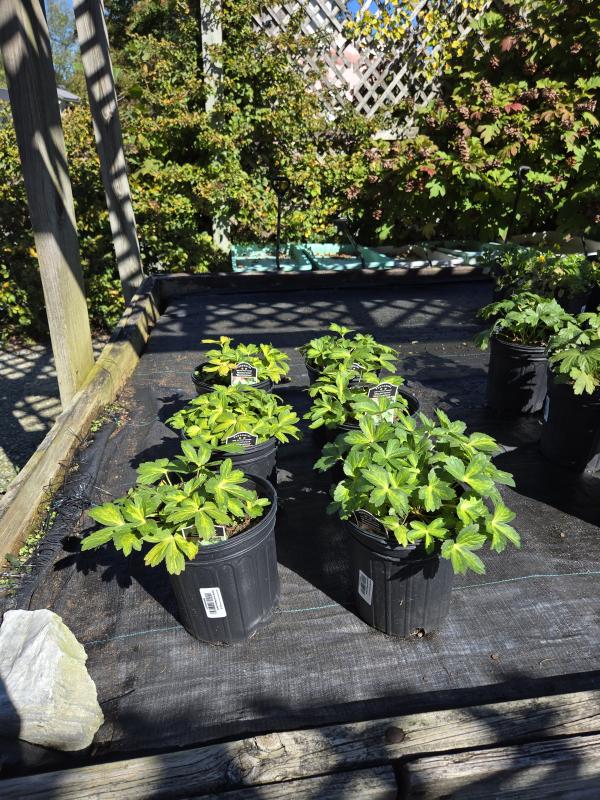 Clump forming plant with deeply lobed, variegated leaves. Wiry stems rise above the foliage, each tipped with a rounded flower head set in a cup of bracts. Excellent re-blooming cut flower. Delicate, pale pink, star shaped flowers held above the foliage. Great cut flower option. Plant in humus rich, moist but well draining soil, in part shade to part sun.