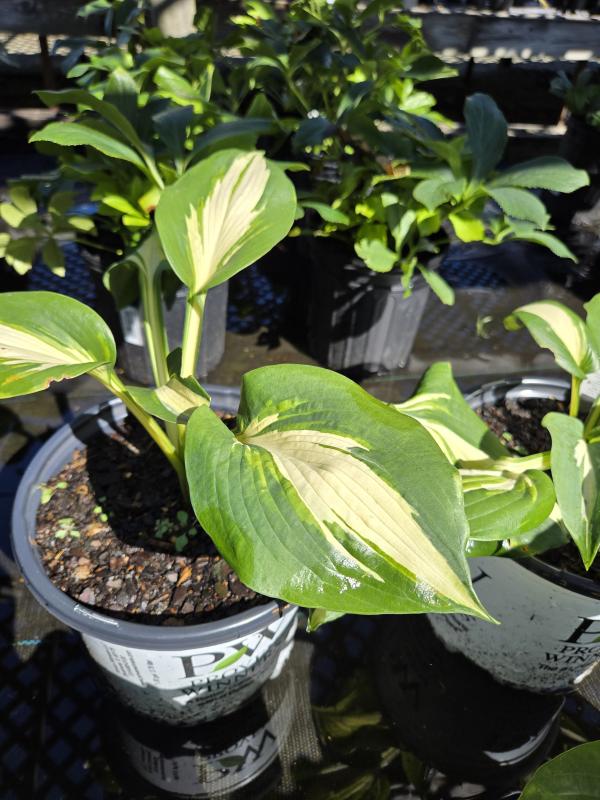 Showy hosta forms a large mound of tricolor leaves with a wide bright blue margin, apple green jetting and a creamy white center.