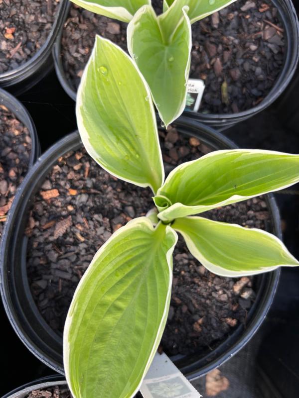 This wonderful sport of ‘World Cup’ features white margins and bright yellow/green centers. The leaves have a very upright habit, making them stand out even more in the flower bed.
