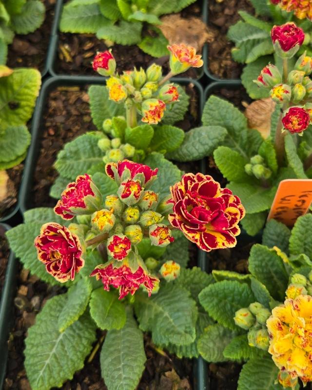 A new series of pollyanna primula, theyโre compact and easy to grow with and extended bloom time. They produce many double flowers on each stem. The first flowers bloom on primrose stems followed by polyanthus stems. Double rosettes held up high in a unique color way of creamy yellow and deep red. Prefers to be planted in part shade to full sun in moist, average soil. Will tolerate boggy areas.