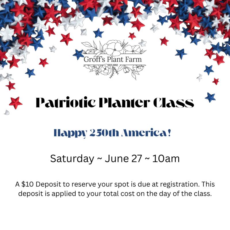Let's make a Semiquincentennial Planter! That's right, America is celebrating 250 years of independence and we are making a Patriotic Planter to celebrate! Sign-up to join our team in designing a planter to be the talk of your Independence Day cookout.