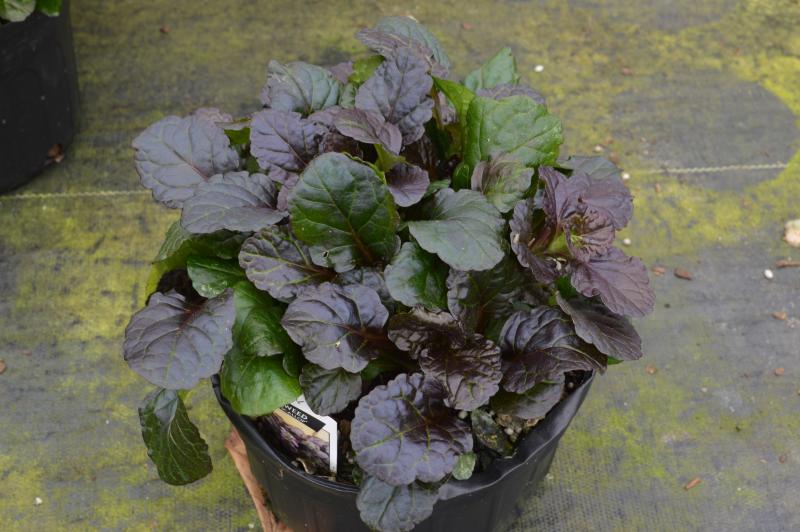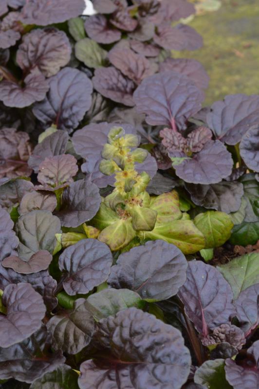 Fast growing groundcover or a knockout in patio pots. Plant forms a mat of ground-hugging rosettes of dark as night shimmering foliage with scalloped leaves and produces short spikes of blue flowers. EVERGREEN. Frost hardy and trouble free plant for shade or sun in average soil. Great dark foliage contrast plant for patio pots. A striking accent plant with white or gold plants. A reliable, small, non-threatening but energetic groundcover. Plant in front of borders, woodland settings,or rock gardens. Use anywhere you need a solid weed proof groundcover. Good for dry shade under trees and shrubs. Deer and Rabbit Resistant. Tolerates being near Black Walnut trees.