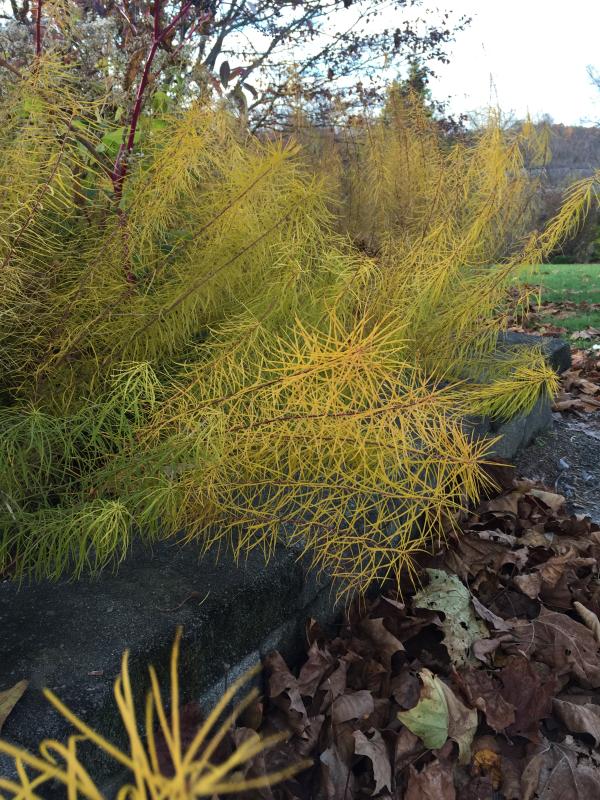 Clumps of ridged stems with fine foliage give this plant a soft texture. Foliage turns bright yellow in fall. Clusters of star-shaped, blue blooms. Full sun or part shade in average to moist soil. Does well in rocky or heavy soils. Native to Arkansas and Oklahoma. Zone 5-9. Good to use in a rain garden. Fine foliage is good contrast for bolder foliage of sedum, and Iris. Shear plants by 1/3 after blooming so plant retains its rounded shape.
