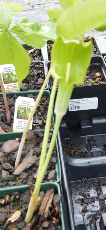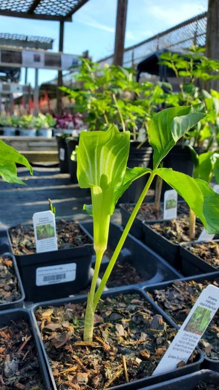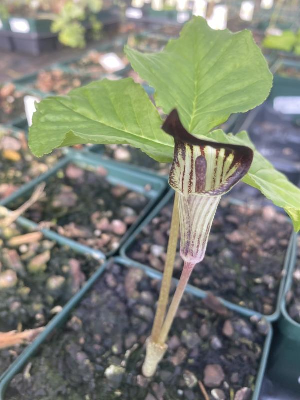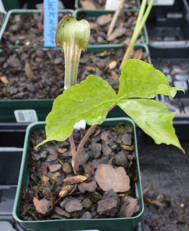 Native woodland plant with large single or paired, 3-lobed leaves that frame the green and purple spathe which drops to hide the green spadix. Poisonous. Humus-rich, moist woodland soil. Tolerates very deep shade and poorly drained soil. Native to the Eastern US. Zones 4-9.