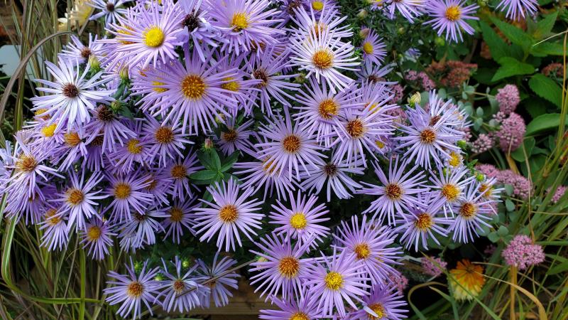 A STRONG GROWING MOUND OF BUSHY FOLIAGE SPREADING 18 INCHES TO 2 FEET. DROUGHT TOLERANT. AROMATIC FOLIAGE. THESE ASTERS ARE TOLERANT OF DROUGHT AND POOR SOILS. PERFORM BEST IN WELL DRAINED SOIL IN FULL SUN. Zone 3-8.GOOD GROUNDCOVER. ALSO USE WITH OTHER AUTUMN BLOOMERS SUCH AS BOLTONIA, MUMS, PLUMBAGO, NIPPON DAISIES.