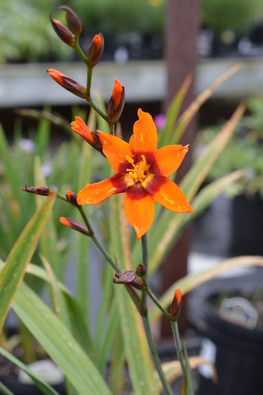 Firey-colored plants with lush green sword like foliage. Flowers are carried on stiff arching zig-zag stems. Good cutflower if harvested when 50% of flowers are open. Very sunny well drained site. Mulch a little over winter. South African native.  Zone 6-10. Plant along with coreopsis, garden phlox, salvias, artemisia, and lavenders.  Mass plantings very effective.