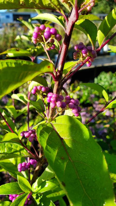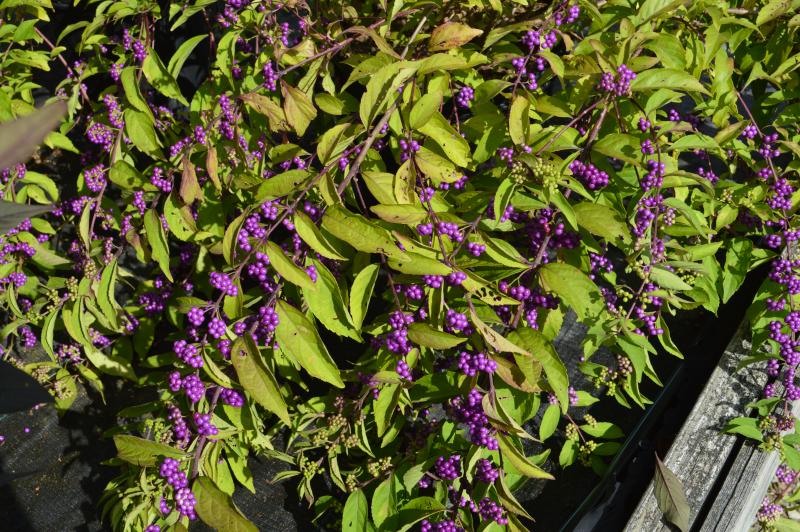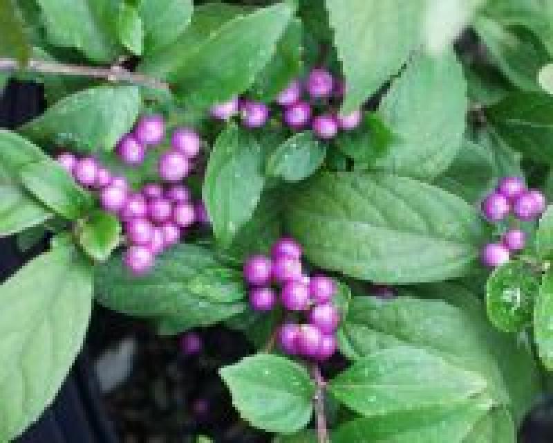 Small pink flower in spring become clusters of bold purple berries that remain on arching branches from mid-summer to mid-fall. Foliage turns a bright yellow in fall. A nice choice for groups, borders, or bird gardens.
