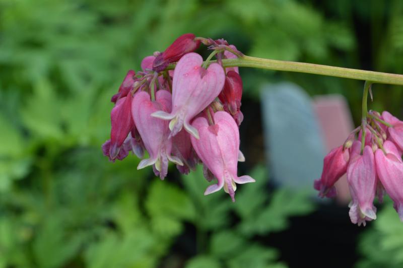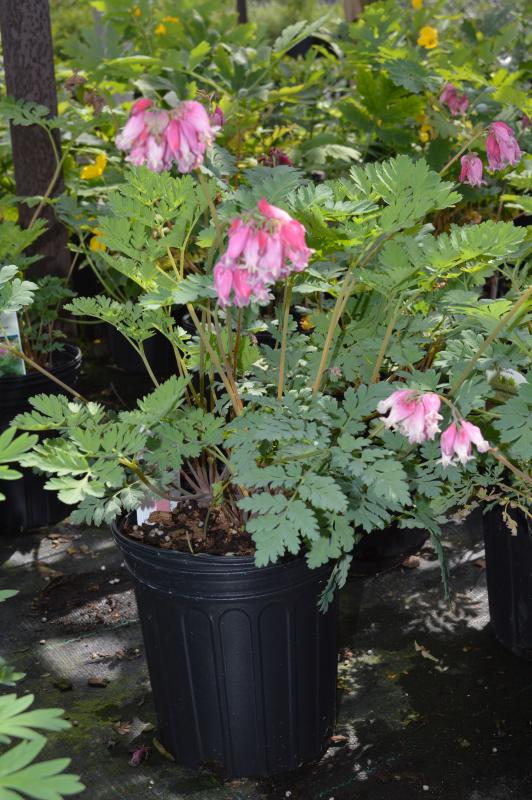 Ferny, gray-green, deeply divided foliage and ever blooming clusters of tubular flowers on outward shooting thin pinkish stems. Tolerates more sun and summer heat than other bleeding hearts.  Partial shade, morning sun recommended, in evenly moist, humus rich soil. Will not go dormant if given adequate moisture.  Native to Western US.  Zone 3-9.