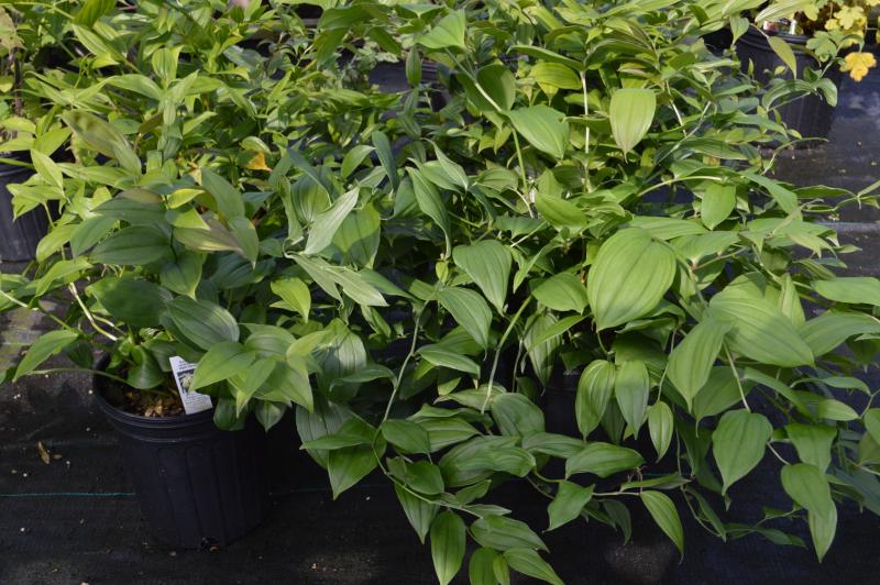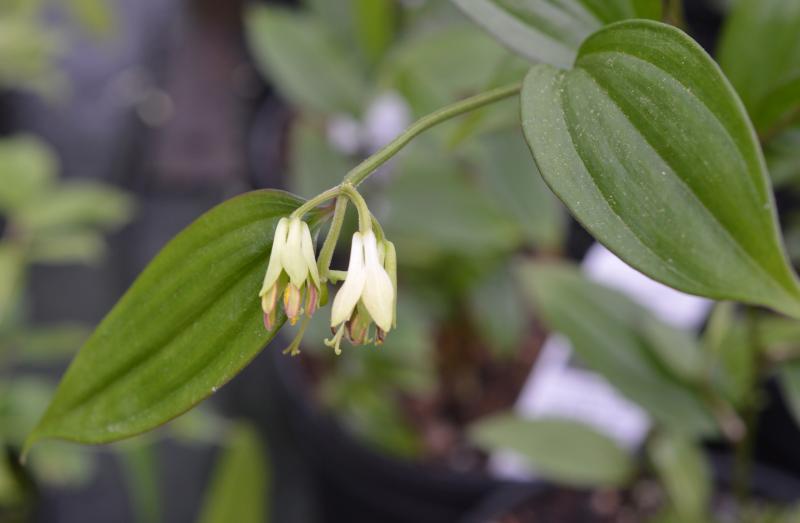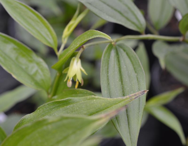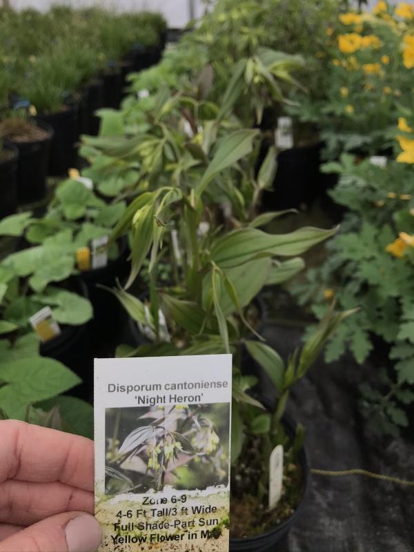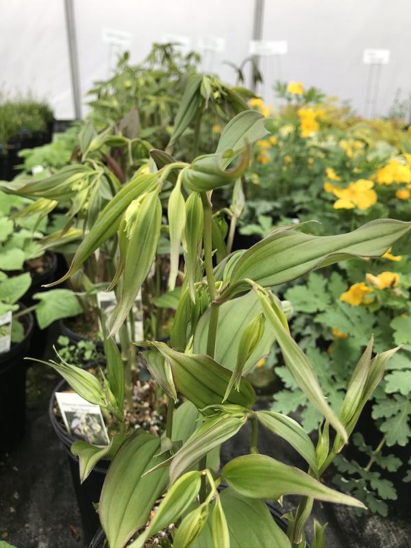 Woodland plant with upright, gracefully arching leafy stems. Foliage emerges dark purple, leathery, oblong. Nodding yellow flowers appear at terminal ends in spring. Partial to full shade in a cool, hummus rich site. Will tolerate dry shade. Zone 6-9. Graceful plant for woodland garden with hostas, ferns, tiarella, woodland phlox, tricyrtis, and galium. Semi-evergreen.