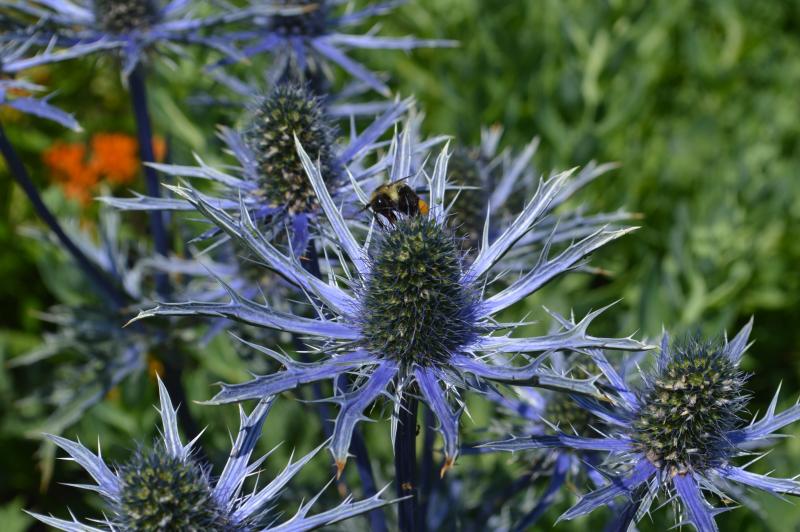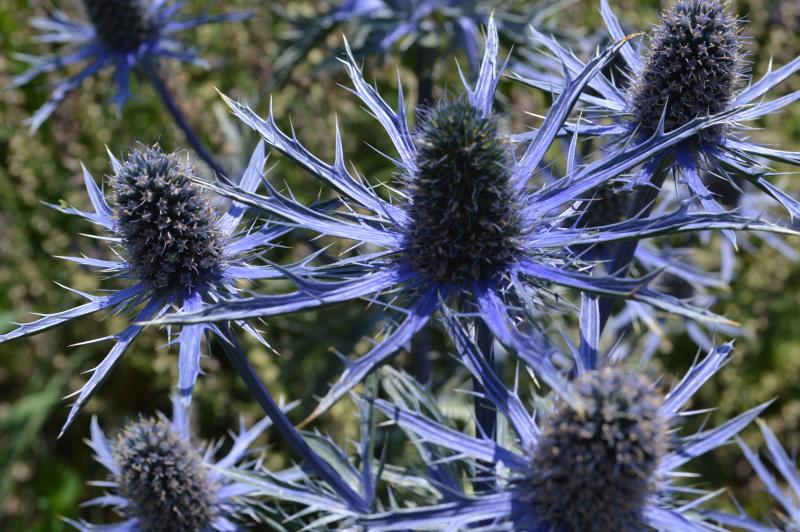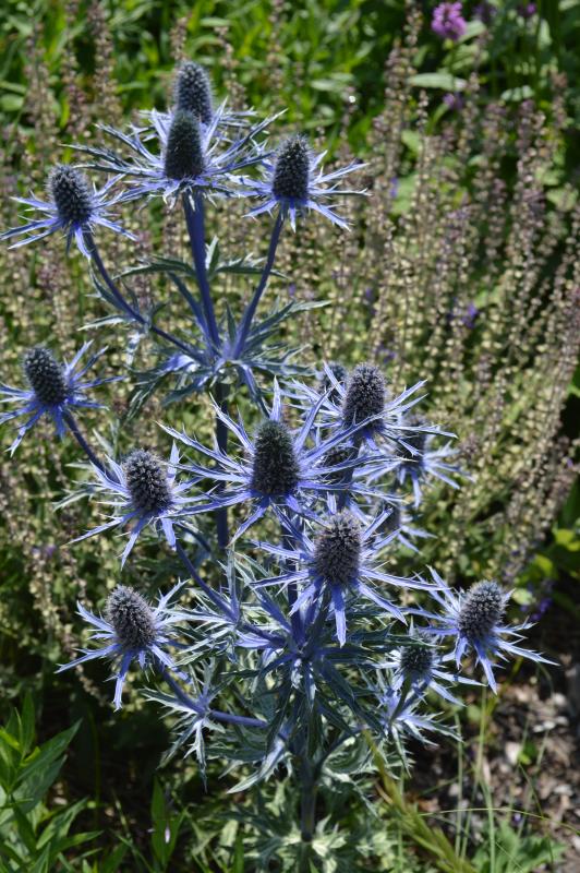 This one is a show stopper. Bold textured, silver green basal foliage bears stiff blue stems topped with iridescent blue flowers with spiny narrow collars. Great cut flower fresh or dried. Interesting accent plant. Grow in light, well-drained moderately fertile soil in full sun. Eryngiums are native to the US. Zone 4-9. Good plants for the sunny border where their shimmering silvery blue flowers contrast well with ornamental grasses and other delicately textured plants. A must in a cut and dried flower garden.