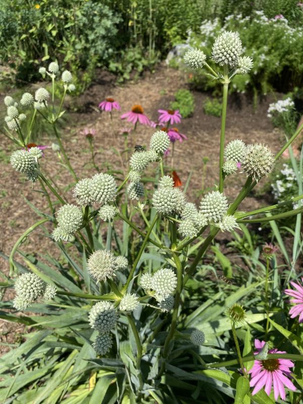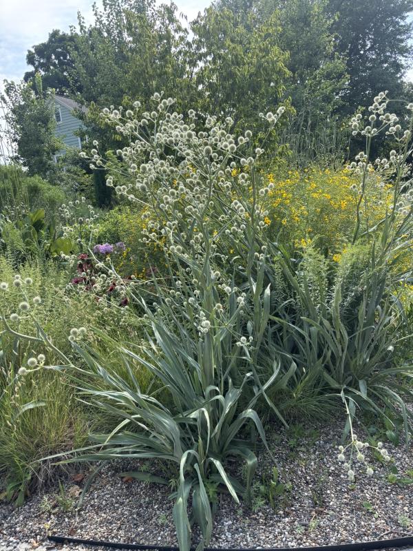 Dramatic, sculptural plant with blue green, yucca type leaves that form clumps and send up stiff, stout, stems branched at the top, and bearing spiky balls. Full sun site with excellent drainage. Deeply tap rooted so avoid unnecessary moves. Zone 3-8. Average, dry to medium soil. A striking accent plant for sunny dry border with gypsophila, oenothera, and nepeta.