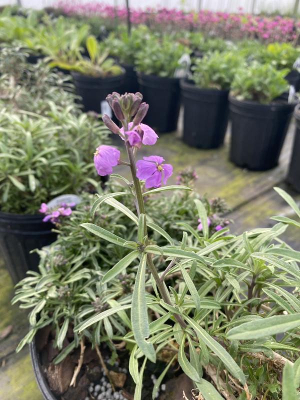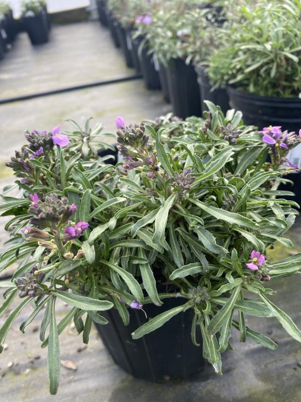 Wallflowers are among the first to bloom in spring and will provide continuous bloom all summer. A gray green, slender leaved evergreen plant with mauve flowers that makes a nice mixed container plant. Well drained, fertile soil in a open sunny position. An extended bloomer, with evergreen foliage for mixed containers or the sunny cottage garden with daisies, iris, delphinium, achillea, phlox, and liatris.