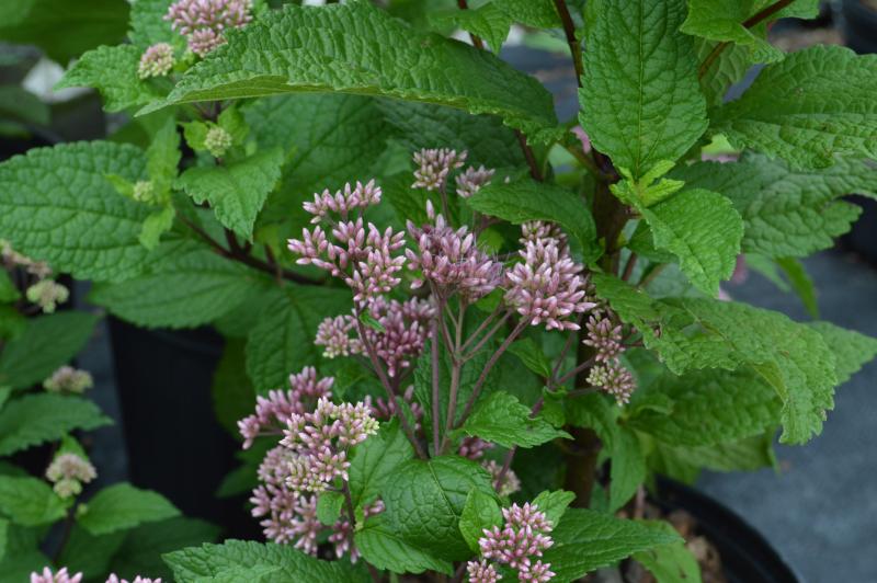A joe-pye-weed with a height more appropriate for the smaller garden. A bold plant with a shrubby look. Stiff stems with opposite lance shaped leaves and large cone shaped clusters of blooms. Butterflies love this plant. Sun to part shade in average moist soil. Will tolerate boggy soil. Use in cut flower garden, meadow garden, mixed border as a specimen plant in the back of border with echinacea, garden phlox, rudbeckia, solidago, heliopsis, daylilies, helenium, fall blooming sedum, and ornamental grass.