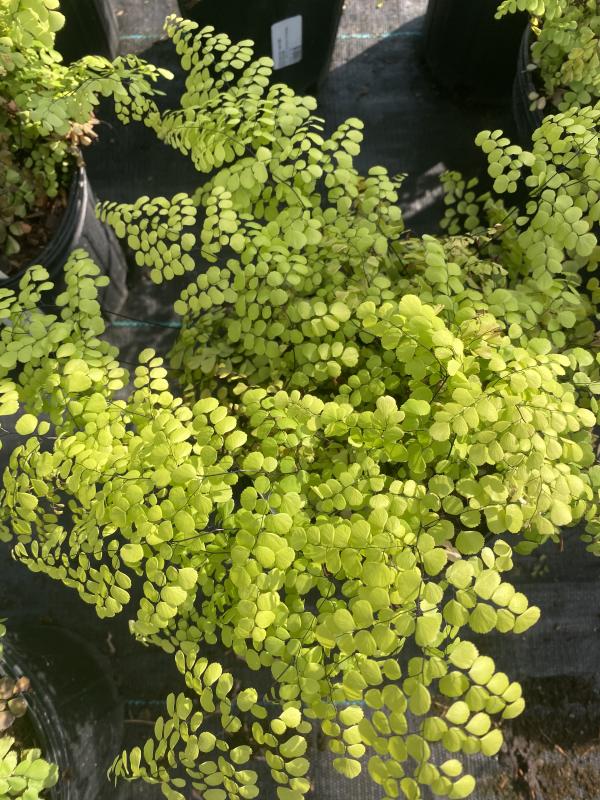 Small fonds composed of many leaflets hang down like fingers from shiny almost black, wiry forked stems. Fronds turn yellow in autumn. Lacey, delicate foliage on black stalks. Evergreen. Native woodland plant for moist humusy soil in dappled to high shade, receiving only morning sunlight and no strong sun light. Foliage sun scorches easily.