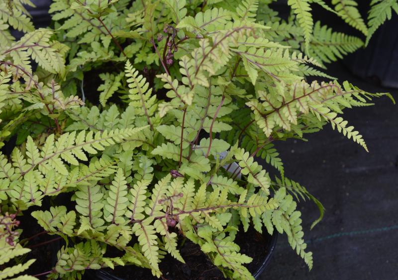Lady fern with dark green fronds and vibrant burgandy stems. Burgandy color takes 2-3 years to develop. Rhizome is short-creeping, resulting in a diffuse crown of fronds. Native to rich, moist, acid woodland soil, in part to full shade. Groundcover plant for shady or woodland areas. Naturalize around shady shrubs and rocky areas. Ferny foliage contrasts well with hosta, asarum, and helleborus. In shady border, pair with purple heuchera to really help the dark stem color to stand out.
