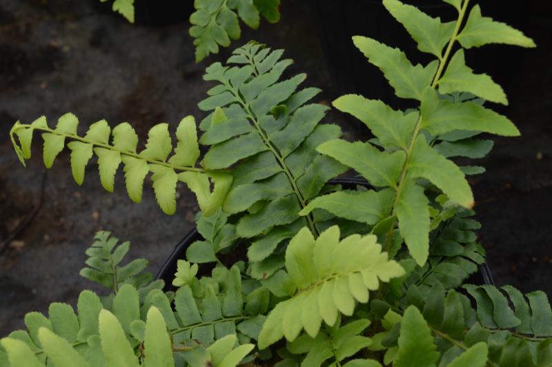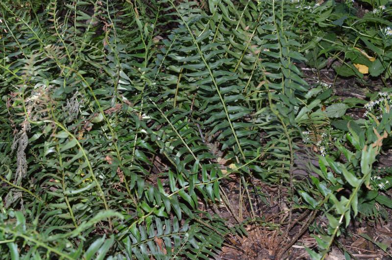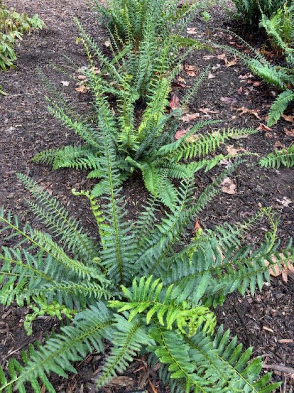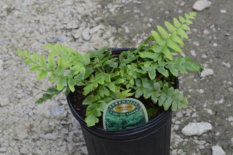 Robust, clump-forming plant easily grown in diverse habitats. Evergreen. Called Christmas fern because still green over winter and leaflets are shaped like stockings. Likes moist woodlands but does very well among rocks and on dryish slopes. Native. Zone 5-10. Excellent for planting on shady slopes for erosion control. Makes beautiful patches of green all winter in woodland landscape.