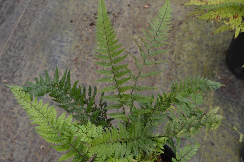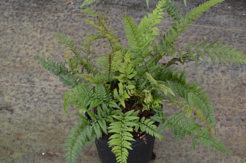 Low growing evergreen fern with a prominent contrasting stripe up the middle. Does well in flower arrangements and can be grown indoors as well. Fast growth rate. Woodland garden. Shady rocky area with good drainage. Native to Asia. Zones 6-9. Great fern to tuck into shady, rocky areas and slopes.