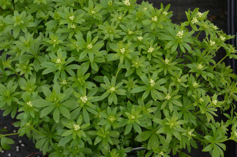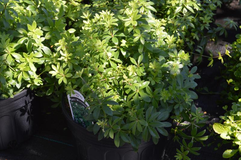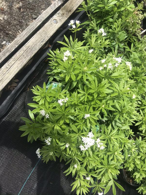 Low growing shade loving groundcover with deeply lanced leaves and small white flowers. Dries as a hay scented herb. Fragrant. Partial shade to full shade and even moisture. Zones 4 to 8. Great to fill in around trees and shrubs. Combine with spring bulbs, virginia bluebells, marybells, amsonia, columbines. Tolerates being planted under or near black walnut trees. Deer resistant.
